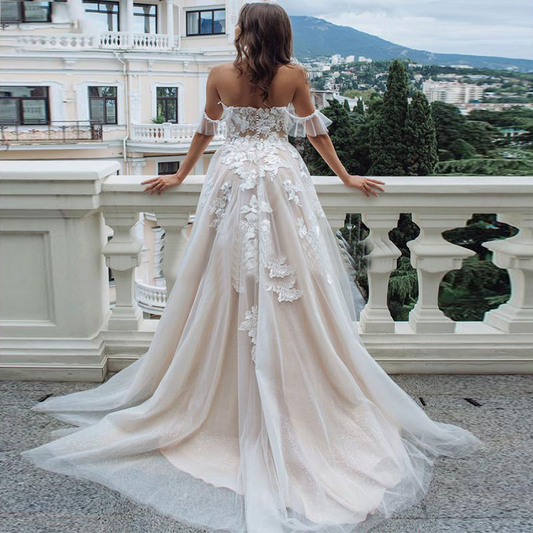 A Line Off Shoulder Tulle Sweetheart Lace Beach Wedding Dress