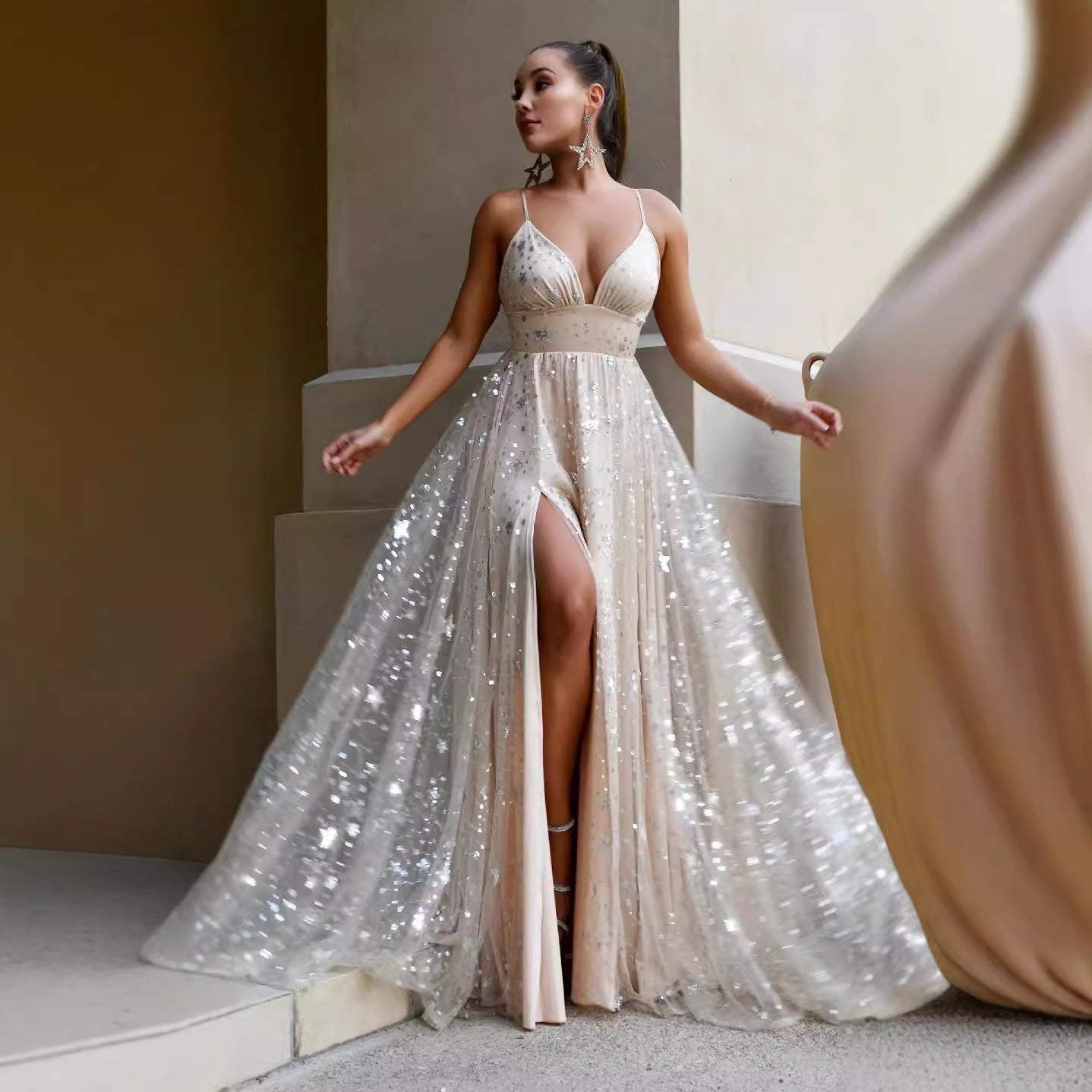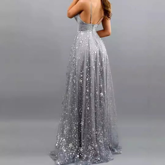 The A-line silhouette flows effortlessly, offering comfort and grace as you dance the night away. Perfect for prom or any special evening, this dress brings fairytale charm with a modern, starry twist.