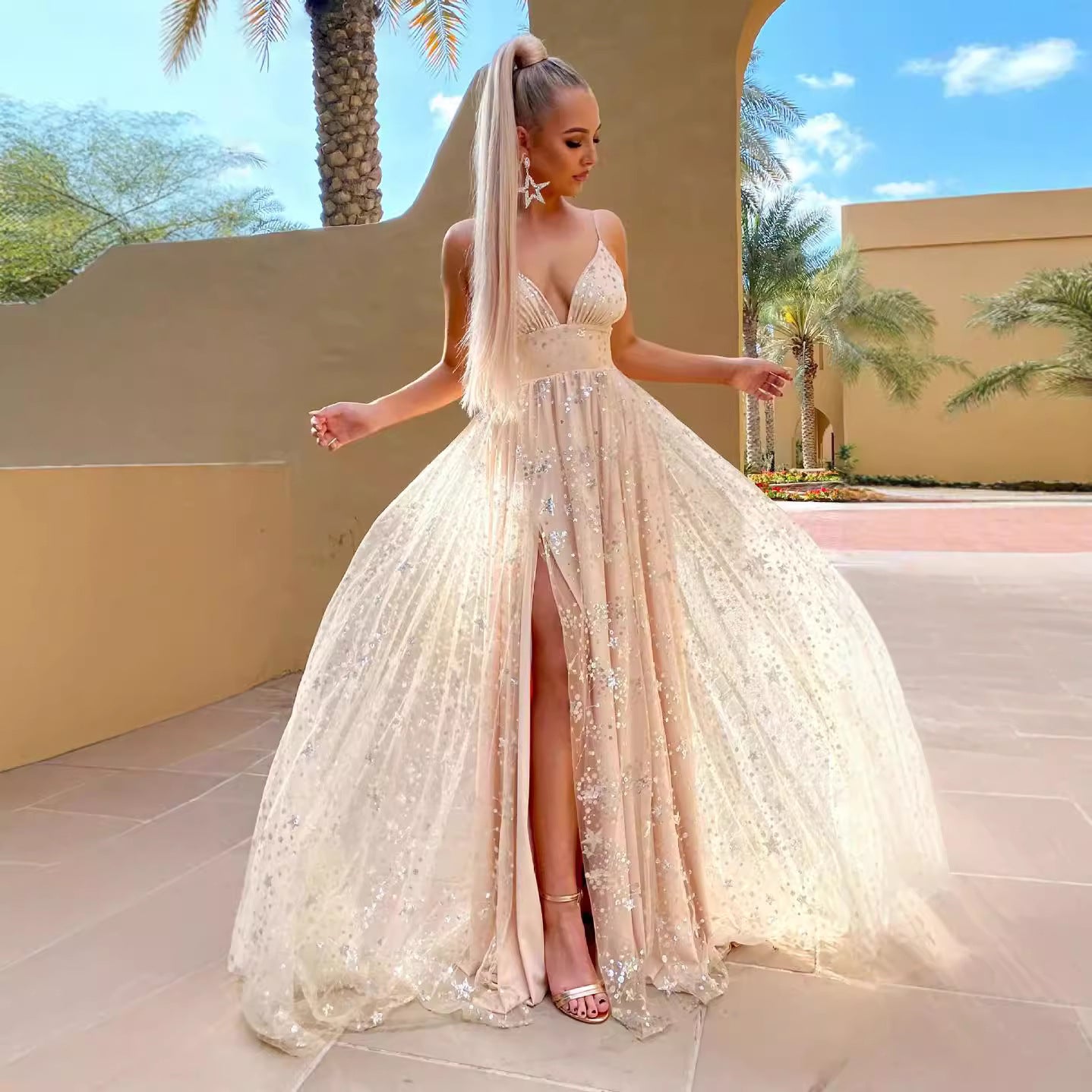 Shine like a star in our A-line V-neck Lace Sparkly Prom Dress With Star Details, made for magical nights and unforgettable moments. The flattering V-neckline and fitted lace bodice create a romantic, feminine look, while delicate star embellishments add a touch of celestial sparkle.